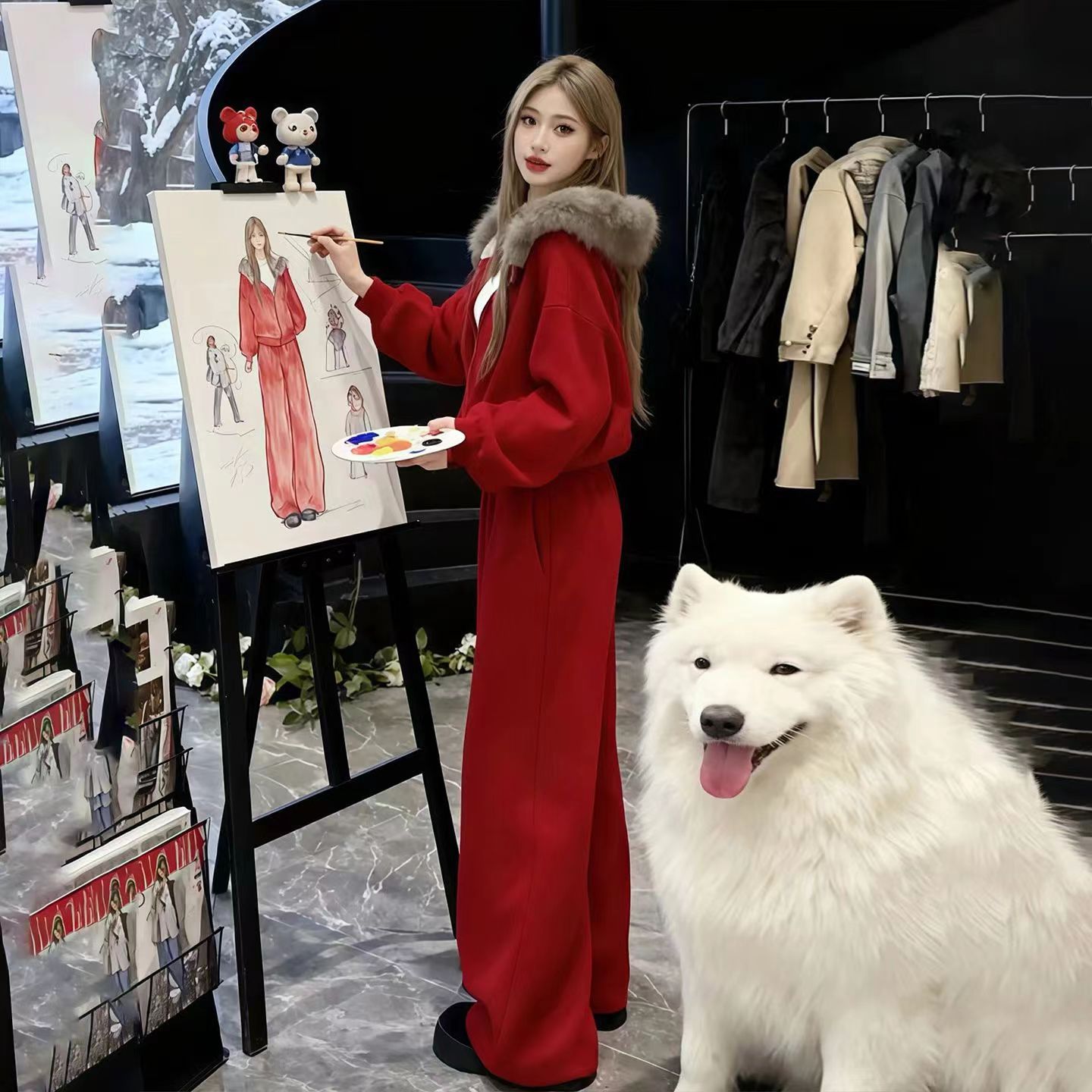 [1]【休閒百搭 新年本命年紅色套裝】加絨大毛領套裝 一入組-NT$1250